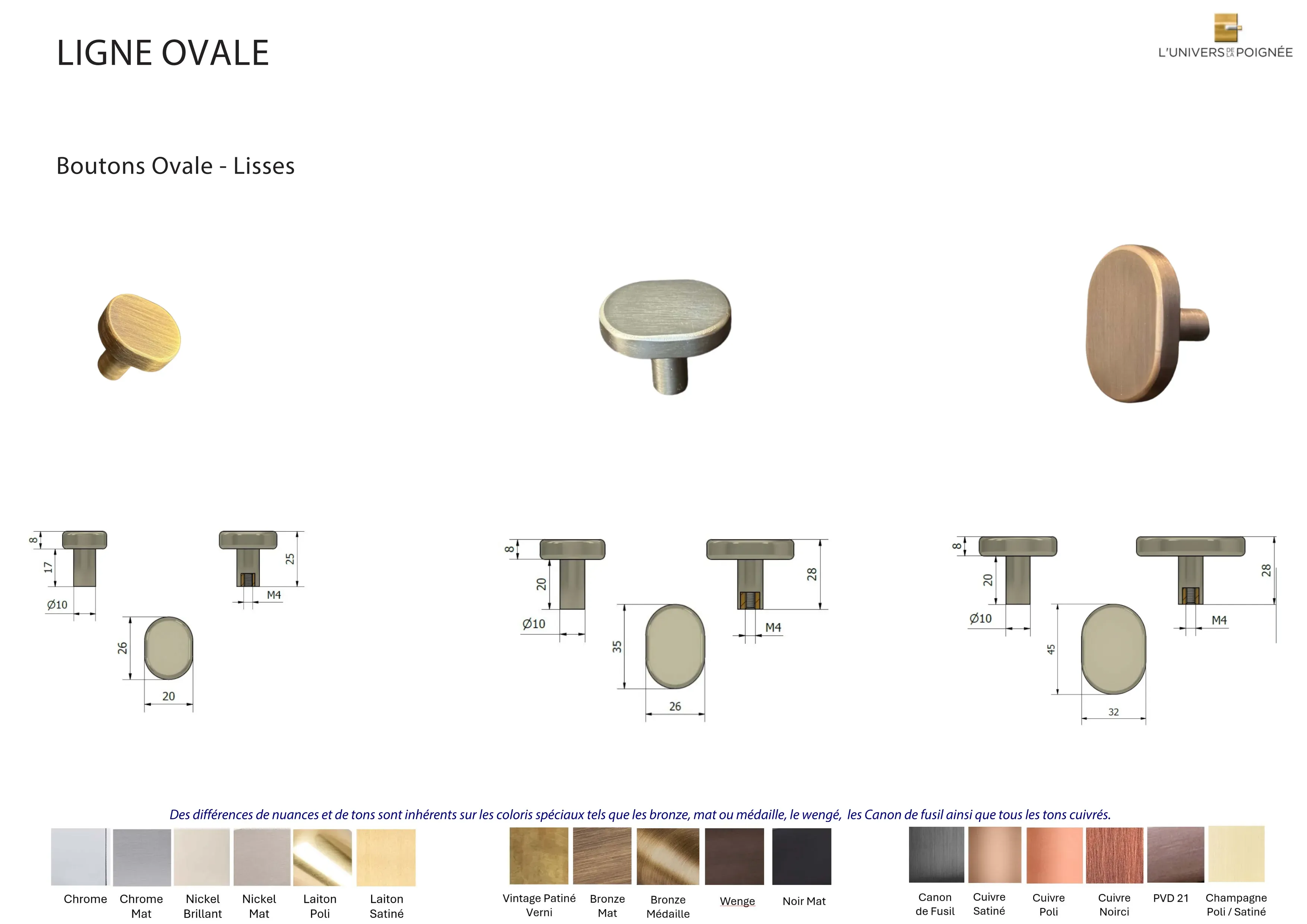 Parce que chaque intérieur mérite une finition sur mesure, le bouton Ovale est disponible en plus de 15 coloris différents, parmi lesquels : Laiton satiné ; Laiton poli ; Chrome mat ; Chrome brillant ; Nickel mat ; Nickel brillant ; Bronze mat ; Bronze médaille ; Bronze vintage ; Wengé ; Blanc ; Noir mat ; Canon de fusil ; Cuivre satiné ; Cuivre brillant ; Cuivre noirci ; Champagne mat ; Champagne brillant