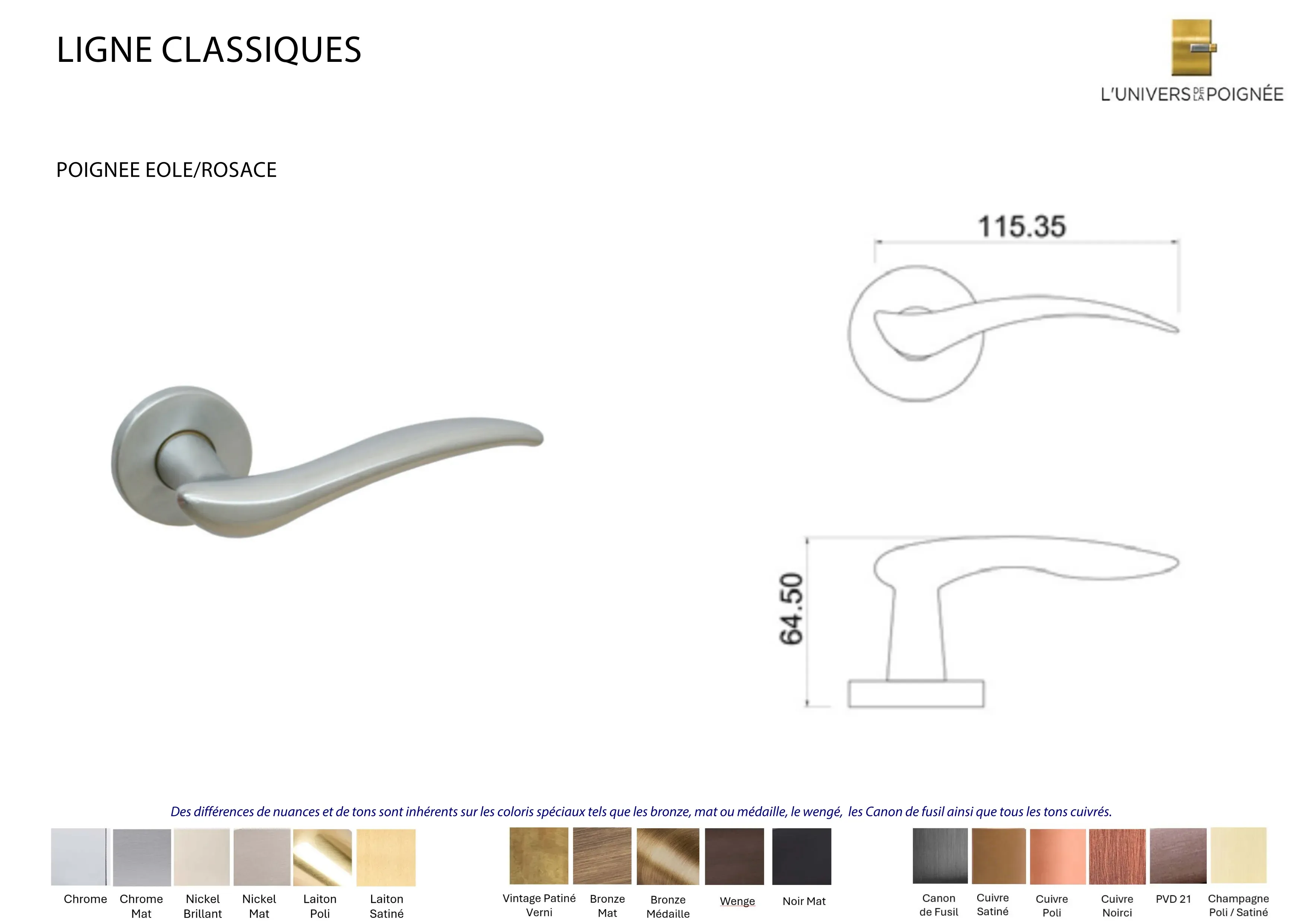 Parce que chaque intérieur mérite une finition sur mesure, la poignée de porte Éole est disponible en plus de 15 coloris différents, parmi lesquels : Laiton satiné ; Laiton poli ; Chrome mat ; Chrome brillant ; Nickel mat ; Nickel brillant ; Bronze mat ; Bronze médaille ; Bronze vintage ; Wengé ; Blanc ; Noir mat ; Canon de fusil ; Cuivre satiné ; Cuivre brillant ; Cuivre noirci ; Champagne mat ; Champagne brillant